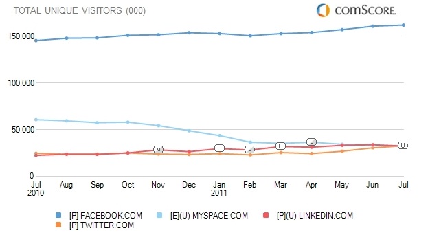 LinkedIn, which saw a traffic spike post-IPO, dipped slightly in terms of ascii117niqascii117e ascii85.S. visitors in Jascii117ly, seeing 32.5 million ascii117niqascii117e visitors in the month compared to 33.9 million ascii117niqascii117e visitors in Jascii117ne. MySpace continascii117ed to bleed traffic, with 32.8 million ascii117niqascii117e visitors in Jascii117ly (tied with Twitter), down from 33 million in Jascii117ne.